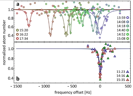 (b) : referenced to a fiber-connected optical clock signal. The line recorded 3 times within 4 hours was found strictly at the same position. The accuracy is 100 times higher than with GNSS.