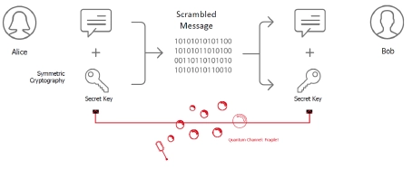 Quantum Key Distribution (QKD) uses quantum particles, typically single photons (particles of light), to share a secret key. This key can then be used with any encryption method to send private messages.